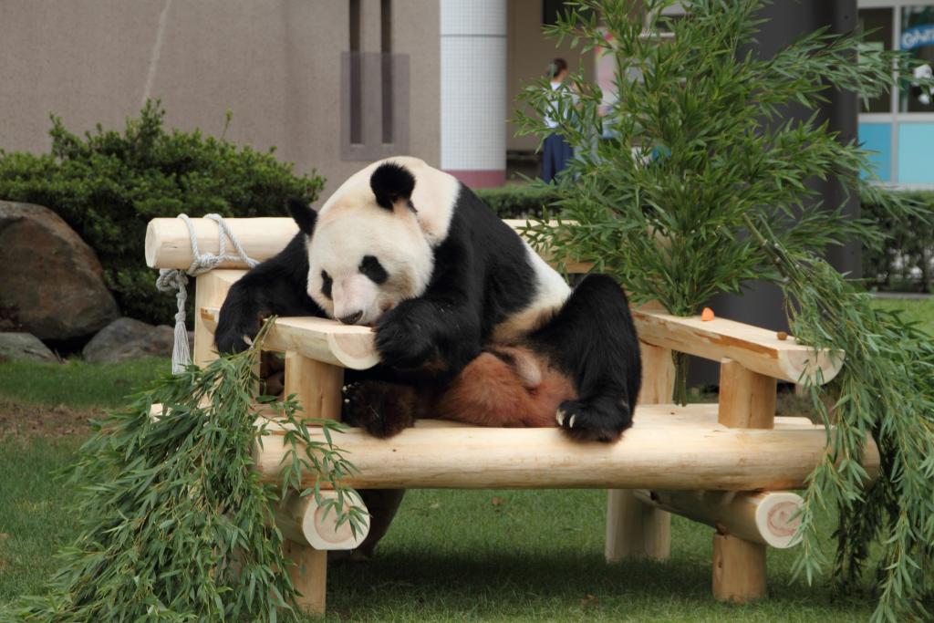 肘かけにもたれかかってまったりとするお父さんパンダ。